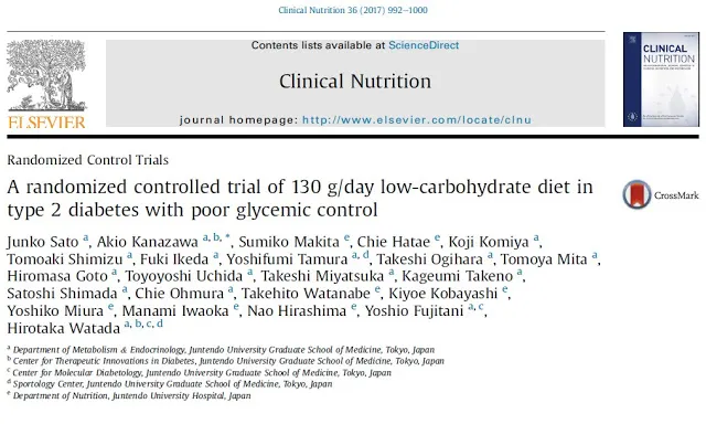 日本的隨機對照實驗研究:探討低醣飲食(130 g碳水化合物/天)和限制熱量飲食(28大卡×理想體重),對血糖控制不佳的第二型糖尿病人的血糖、體重、飲食效果