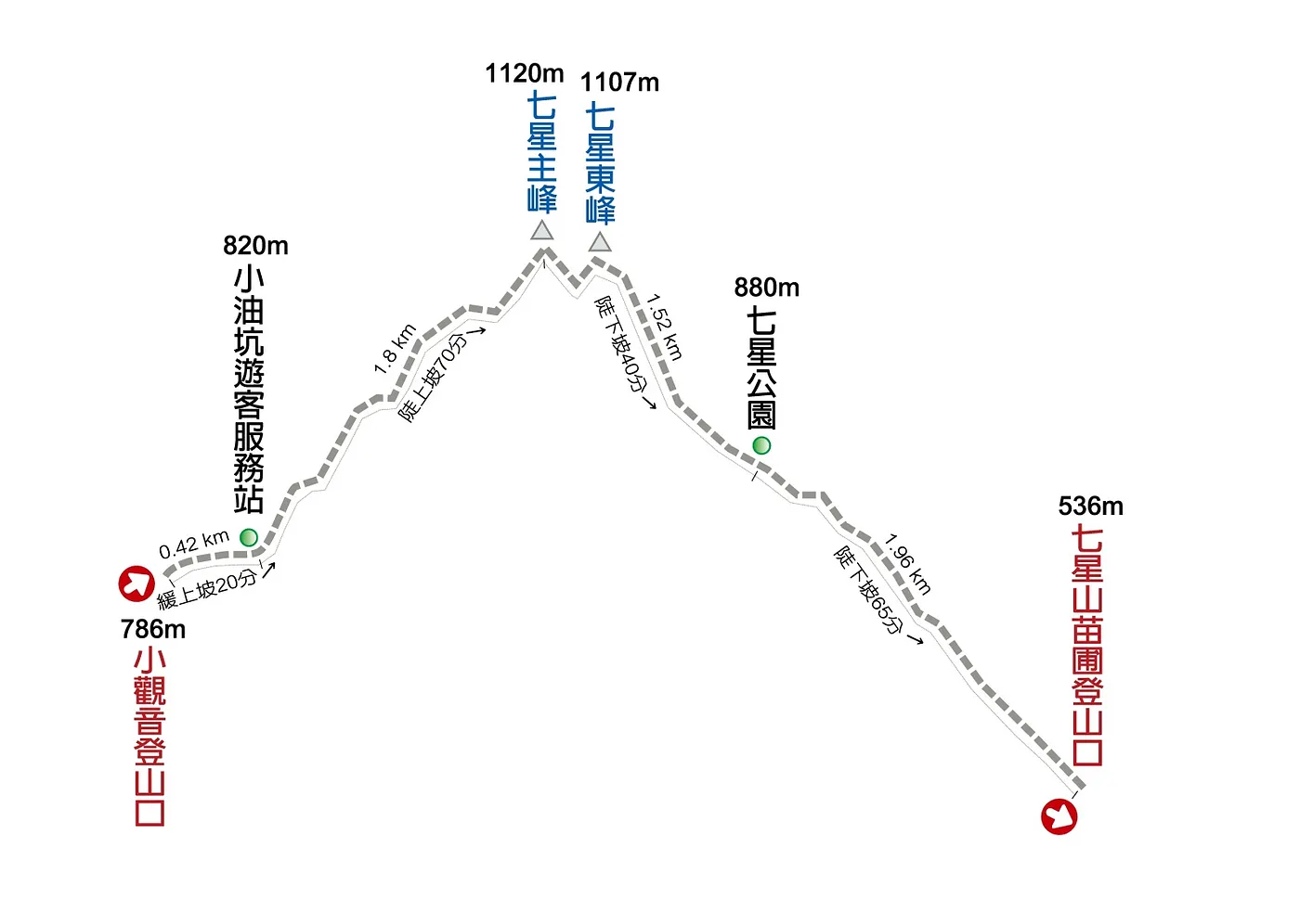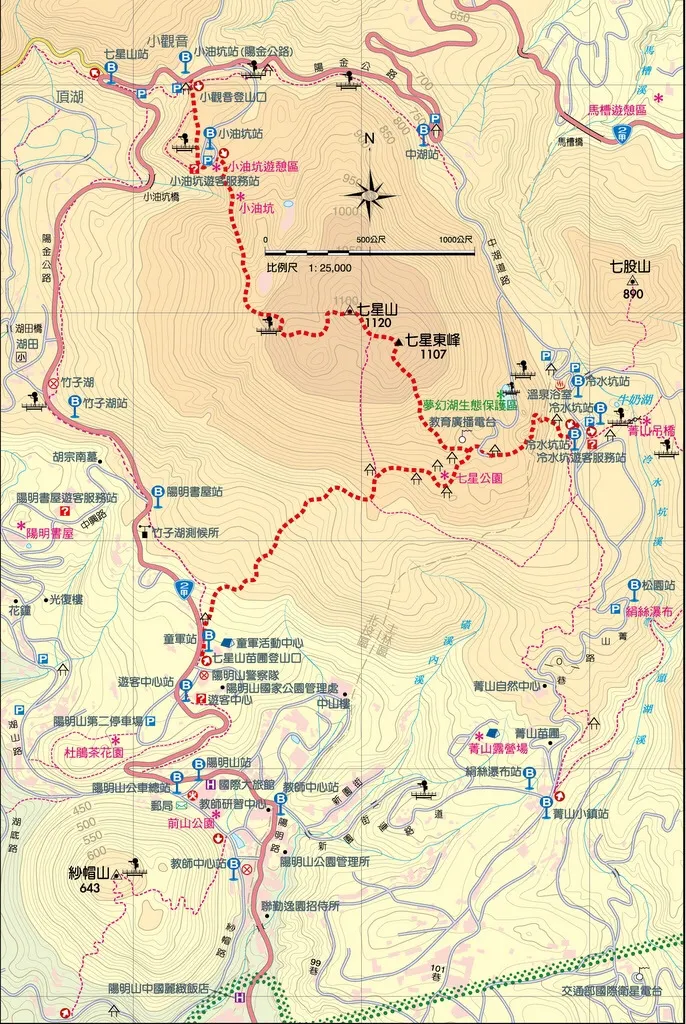 爬到台北第一高峰「七星山」有三大登山口:小油坑(海拔820公尺)、冷水坑(海拔750公尺)、苗圃(海拔536公尺)